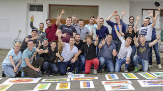 Bild: Kreativer Abschluss mit Kunstmaler Sven Spiegelberg und Coach Markus Stutz. Das Team der A. Meier Gartenbau AG am Ende des Coaching-Prozesses.
